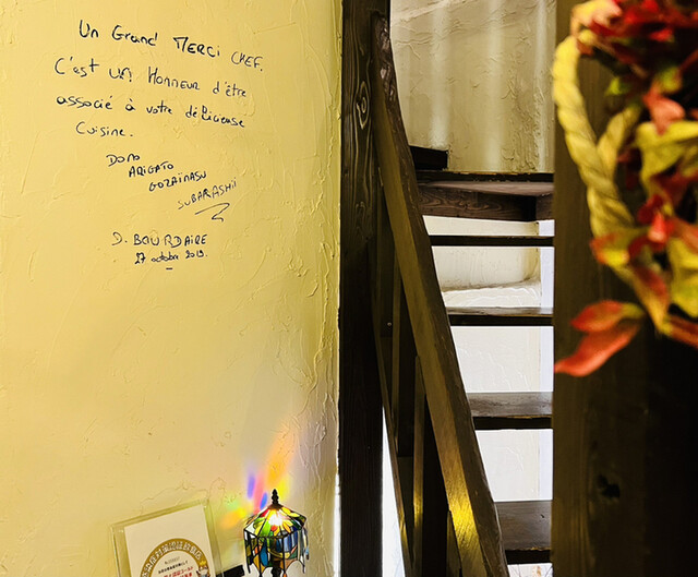 料理は、凄い素材を使って豪華という訳ではなく、厳選した食材を使って、フレンチの技巧と和のエッセンスを融合させた独自のものばかり。特にスペシャリテの「聖護院の生八つ橋とフォワグラとリンゴ」は、フォアグラのパテに生八つ橋のにっきと抹茶の香り・リンゴの酸味を合わせた逸品で、和洋折衷ながら調和のとれた味わいが見事です。それ以外も素材の味を活かしながらも、創意工夫に富んでいて、本当に楽しめました。