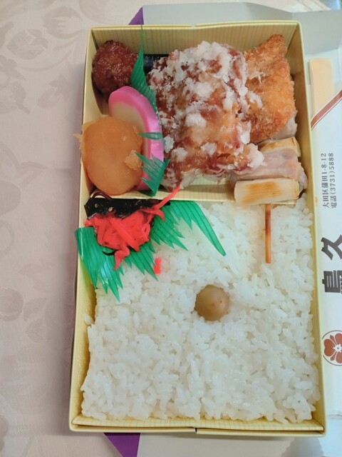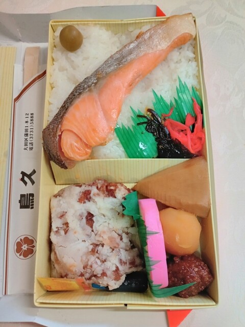 焼き鮭、唐揚げ、つくね、じゃが芋煮付、筍煮付、蒲鉾、切昆布と紅生姜、ご飯、青小梅漬。辛子、醤油付き。