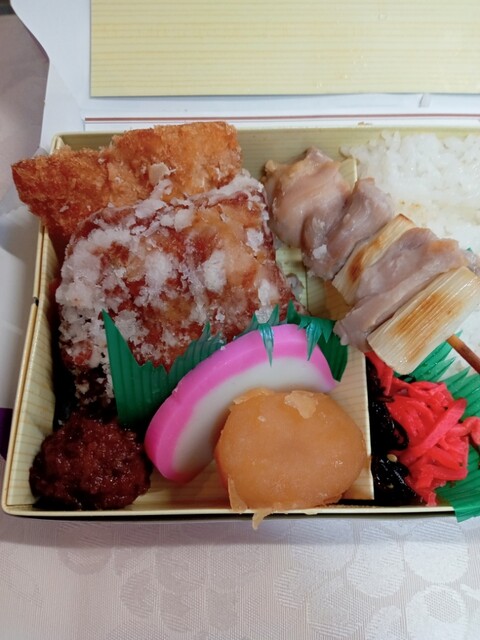 唐揚げ、チキンカツ、焼鳥(塩焼)1本、つくね、じゃが芋煮、蒲鉾、切昆布、紅生姜、青小梅漬、ご飯。