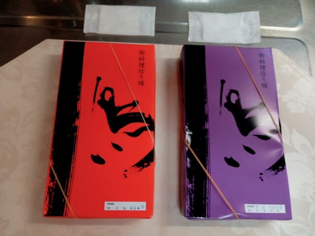 赤が鮭弁当。藤色(幕の内弁当がもっと濃い紫色のため藤色と記載)が特製弁当。