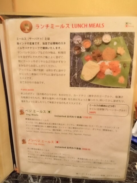 ノンベジミールス アンリミテッド(ランチタイム)2000円税込。