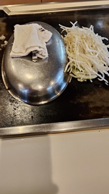 取っ手付きで楕円のドーム型をした金属の蓋をかぶせ、次に隣りのスペースに牛脂とニンニクスライスを乗せると、その上に玉ネギ、ピーマン、もやしを積み上げた。