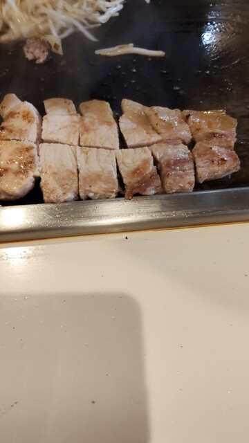 しばらくすると年配のお母さん(大女将)が野菜(もやし、玉ねぎ、ピーマン)の入ったザルと、肉(豚ロース厚切り、ハンバーグ)の入ったザルを持ってきて、鉄板に火をつけてテーブルから離れた。