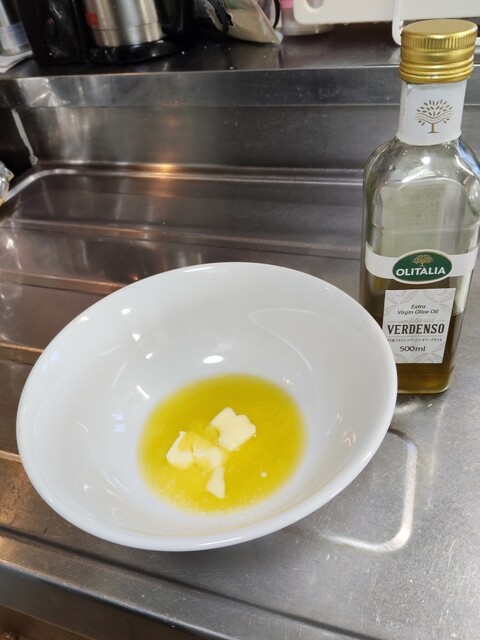 深皿にバターとオリーブオイルを入れて常温で柔らかくしておく。バターだけでおいしいが、中性脂肪が増えそうで、オリーブオイルと合わせた。