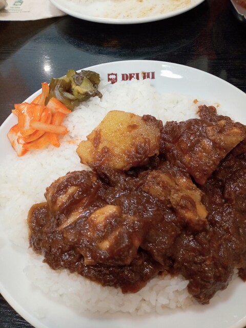 カレーに入っているのはチキンが3片、ジャガイモが1片。私が初めてめて食べた頃はチキン2片、ジャガイモ2片で肉はチキンかマトンの2種類だったが、数年前(10年位前かも)からチキン3片、ジャガイモ1片へと変わった。