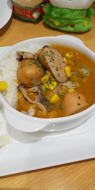 フランクとキノコのカレーは、ブリブリとしたフランクフルトと各種キノコ、コーンの具材。見た目も黄色く一口目はかなり甘く感じるが、後からスパイシーな辛さが押し寄せて来て、中辛レベル。フルーティーフルーティーからピリッとツンデレ女子のようなカレーで、気軽に食べれるならハマりそうなお味でした。