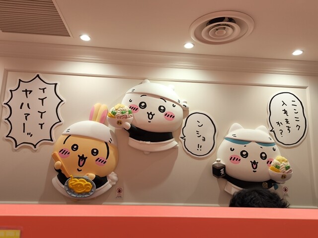 らーめん豚ミニは、極太麺に野菜(モヤシ・キャベツ)・チャーシュー・ちいかわのはんぺん・にんにく・揚げ玉がトッピングされています。