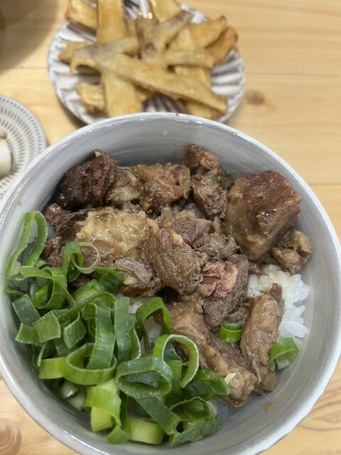 肉うどんにごぼう天をトッピングと肉ごはんを食べました、あっさり出汁で最後の一滴までとても美味しかったです。
