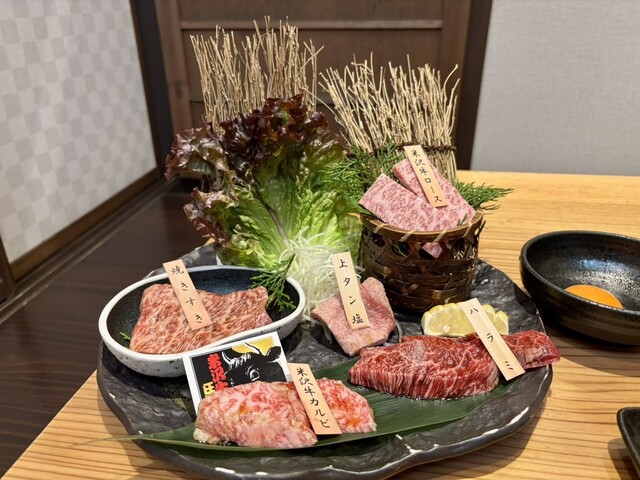 注文したのはいつもの「特選極み盛りランチ(中)」(5,280円)。このランチセットは、米沢牛ロース、米沢牛カルビ、ハラミ、上タン塩、焼きすき、ご飯、スープ、カクテキ、ドリンクです。特に絶品なのは、米沢牛ロースと焼きすき。ロースは柔らかく旨みが濃厚で、美味しさが格別です。そして、焼きすきは薄切りのお肉をさっと焼いてたまごに絡めて食べます。繊細ですがしっかりとした旨みが感じられます。