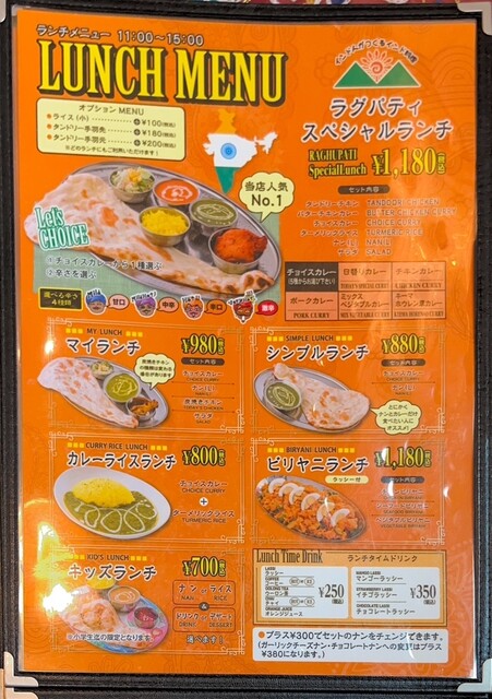 ①日替わりカレー②チキンカレー③ポークカレー④ミックスベジタブルカレー⑤キーマほうれん草カレーから1つ選べます。