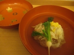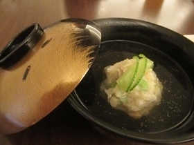 じゃがいも饅頭柔らかく、アナゴと菜の花の