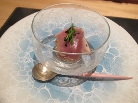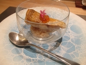 牡丹海老、帆立に上から表面にはコンソメジュレと穂紫蘇