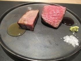 ・ 黒毛のタン燻製焼き 岐阜県飛騨牛ランプ 赤ワインソース 山葵