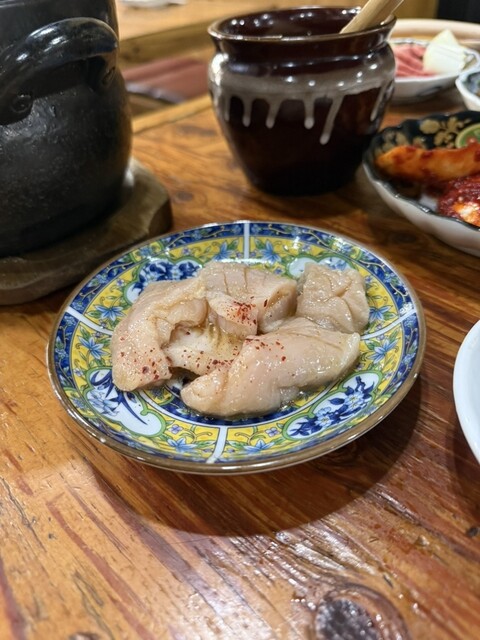 丼には三種の醤油(刺身醤油、謎の甘め醤油、卵かけご飯用卵醤油)がついており、小鉢三種(粗煮、茶碗蒸し、おひたし)、吸い物がセット。