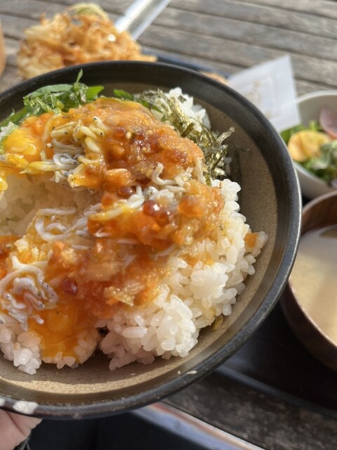 ぜんぶのせ、みたいな定食と頼んだけど、色々な種類のおかずを食べられるから、凄くおすすめです。しらす丼は卵黄がついてるタイプで、ほんと美味しかった♡