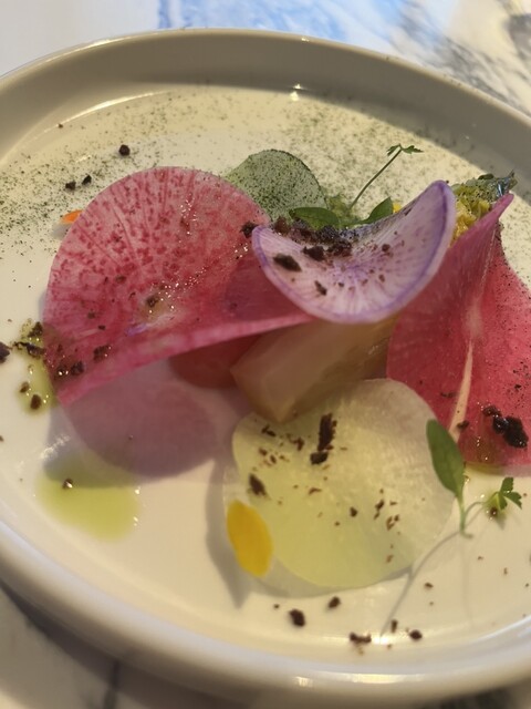 大根メインの冷製のバーニャカウダです。薄く丁寧にカットされているので、とっても食べやすかったです✨