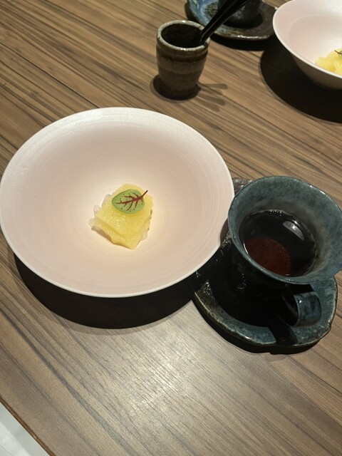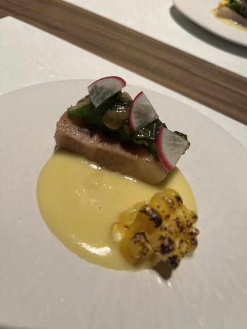 向付は、黒宝豚(こうほうぶた)にとうもろこしのソースが添えられたもの。