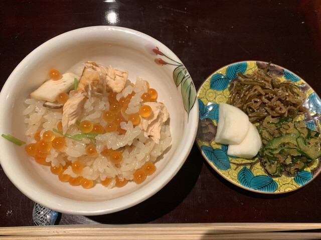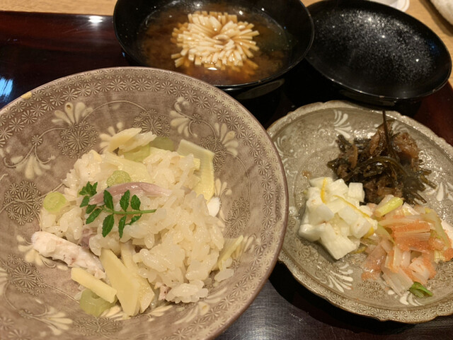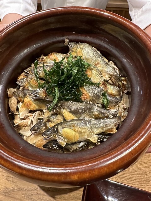 ・松茸と子持ち鮎の土鍋ご飯と漬物 豆腐の赤出汁