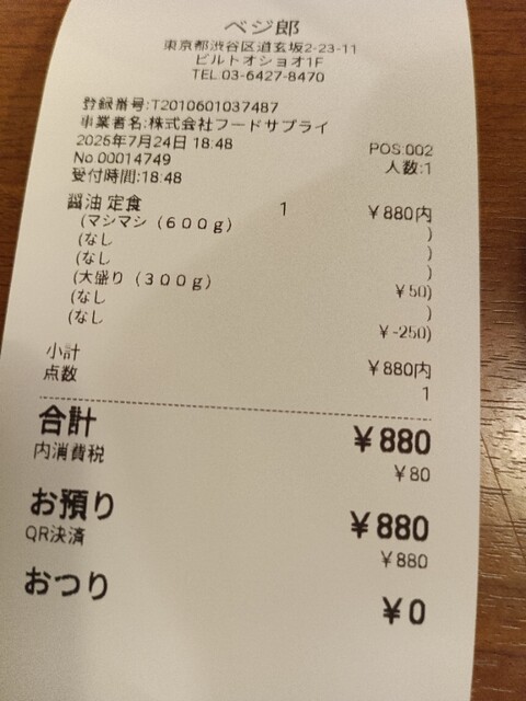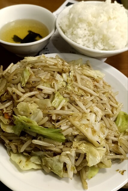 肉抜き、ご飯盛り、野菜マシマシの醤油味の野菜炒め定食880円を注文。