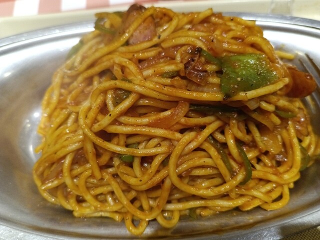 ナポリタンのメガ盛りに、スタンプアプリで目玉焼きとベーコンを無料でトッピング。セルフで、コンソメ風スープ1杯が無料なので頂きました。ベーコンは焼が弱くて自分はカリカリに焼いた方が好きなのでちょっと残念でした。夕食時でしたが待ち時間は5〜10分程度でした。