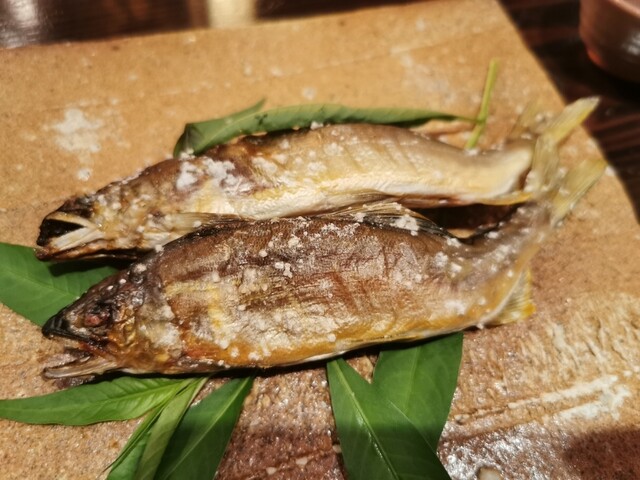 囲炉裏でじっくり焼かれた鮎の塩焼きが二匹。美味しいー幸せ。