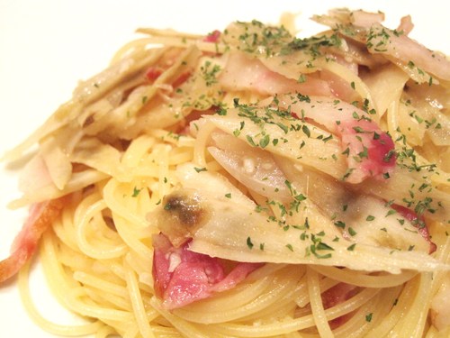 本日のパスタはゴボウとベーコンのペペロンチーノ。