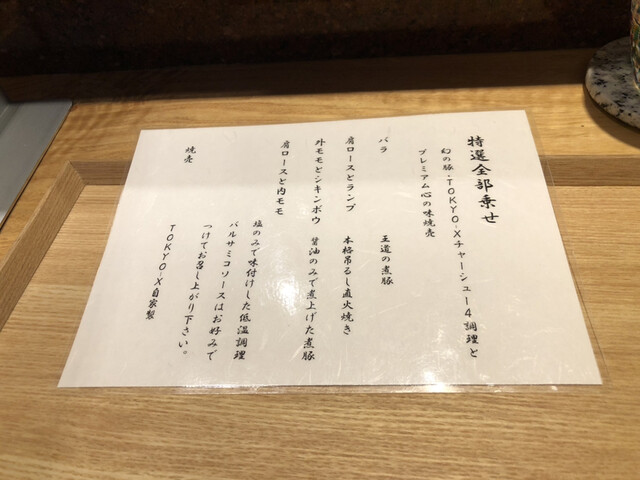 TOKYO-Xを使った焼豚4種類、プレミアム手包み心の味焼売、特にバラ王道煮豚は正に頬が落ちる程美味しいです。