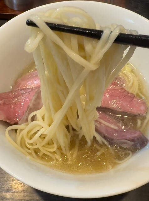 麺や福はら さんで、和牛そば。和牛出汁の香りと旨味がギュウギュウに犇くめっちゃうまスープ。俄然啜りたくなる超柔麺がスープ持ってきて美味い。リブロースとササミが数回噛むと溶けていく柔らかさと美味さ。淡い塩味のスープに白胡椒を溶かしながら味変を楽しむ。めっちゃうま!