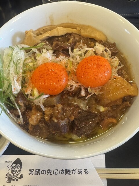 麺処 にしむら さんで、どてやきまぜそば(どてW、麺大盛り)とろける程に煮込まれた牛すじ肉と控えめなコンニャクとモチモチツルシコの平打麺を混ぜて食べるめっちゃうまなまぜそば。〆のライスダイブで、どて丼がこれまた美味い!ゴマ油と酸味の胡瓜の漬物ナイッスゥゥゥゥゥ!!!!めっちゃうま!