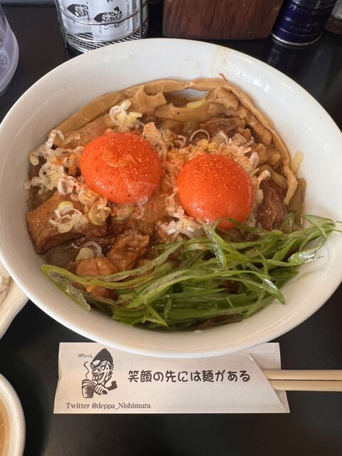 麺処 にしむら さんで、どてやきまぜそば(どてW)大阪名物どて焼きがたっぷりのめっちゃうままぜそば。大好物なんです。盛り付けがまん丸笑顔!てんてんnice!麺にタレがよく絡みモチモチっとした程よい弾力ある平打ち中太麺。最後に御飯ダイブで余すところなく堪能!胡瓜の漬物nice!!! めっちゃうま。