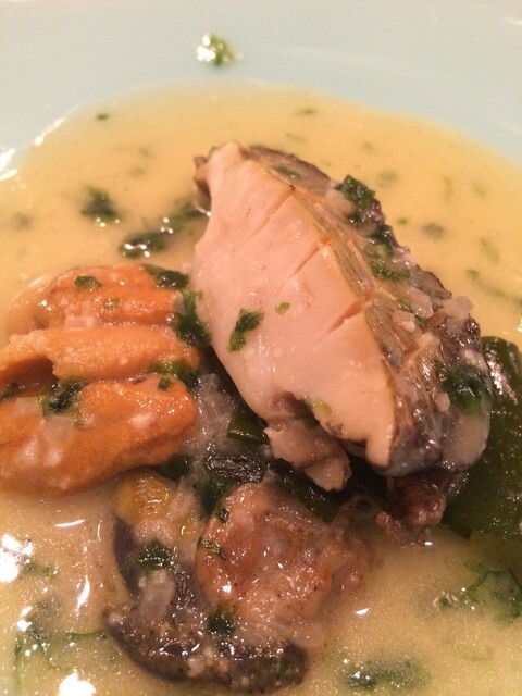 じっくり蒸したものに、魚介の旨みとバターが混ざったソースと、雲丹を!