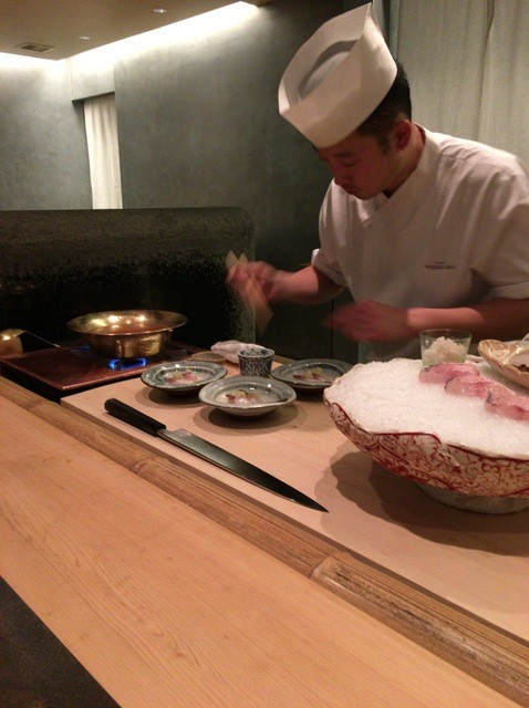 綺麗に捌かれた鯛と野菜が登場し、目の前で手際良く調理されていきます。
