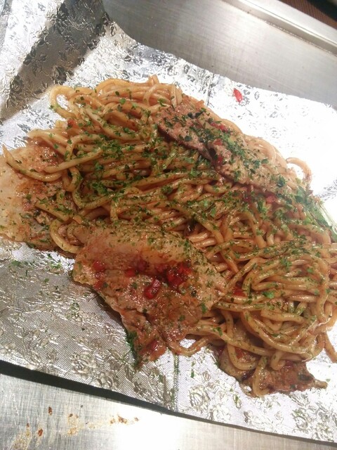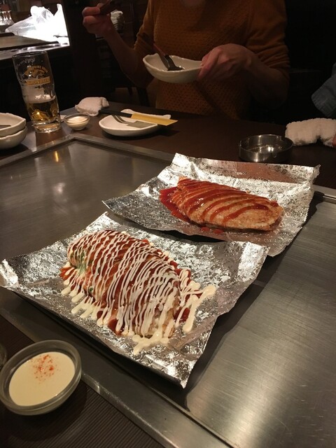 メニューは、肉や魚介の鉄板料理の他に、お好み焼き等の粉ものも。