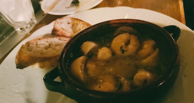・海老とマッシュのアヒージョ。間違いない味。ワインに合わせる定番を絶対外さないのも大事。
