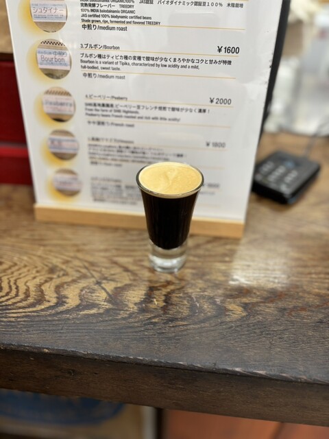 まるい超深煎のエスプレッソをショットグラスで(11g)。焙煎が変わったのか?最近、旨みが増している気がする。鼻から抜ける香りが独特で、ある時は花の香り、ある時は発酵したフルーツの香り、それらが複雑に絡み合っている。ラテや水出しのアイスがオススメのようだが、ここのコーヒーの真価はエスプレッソに現れる。