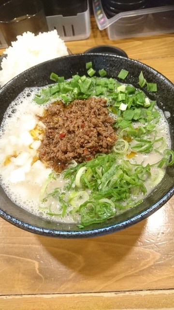 濃厚豚骨スープに台湾ミンチ、タマネギ、ニラ等をトッピングした、台湾まぜそばの汁あり品って感じ。