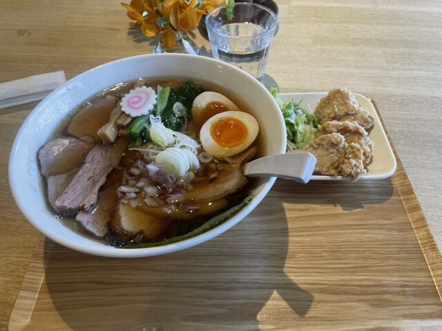 今日もチャーシューワンタン麺1,400円、美味しそうなので唐揚げ300円を注文です。ちなみに一緒に行った母は白味噌ラーメンです。