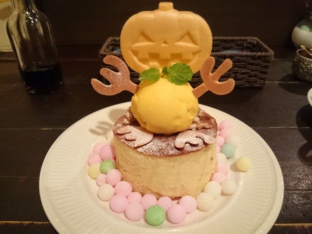 かなり厚いホットケーキの上に、真ん丸のパンプキンアイス。カボチャの顔はモナカの皮です。