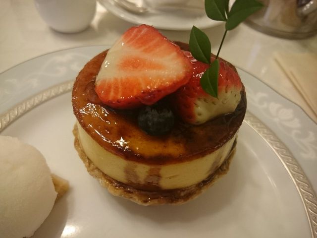 苺ソースと生のいちごと生クリーム、その上にシブーストがのってます。ふわふわのプリンみたいな感じでやっぱりおいしい~
