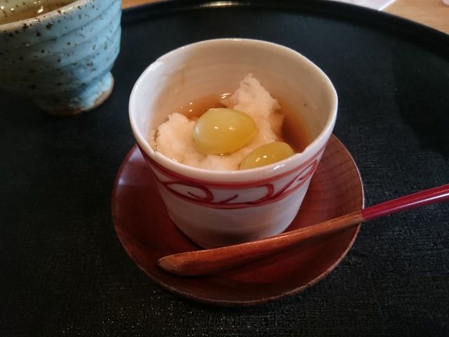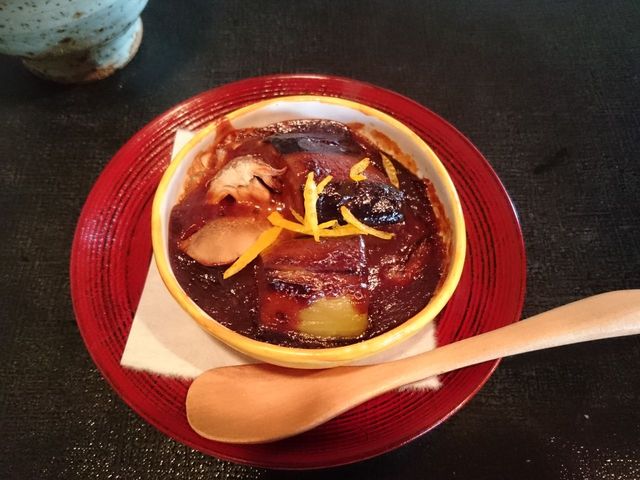 さつま芋のクリームの上にシナモンのゼリーとプルーンのゼリーがのってました。このシナモンが八つ橋を彷彿させる(笑)味なのですが、クリーミーなお芋にとてもあうんです。今までに味わったことがないようなデザートでした。