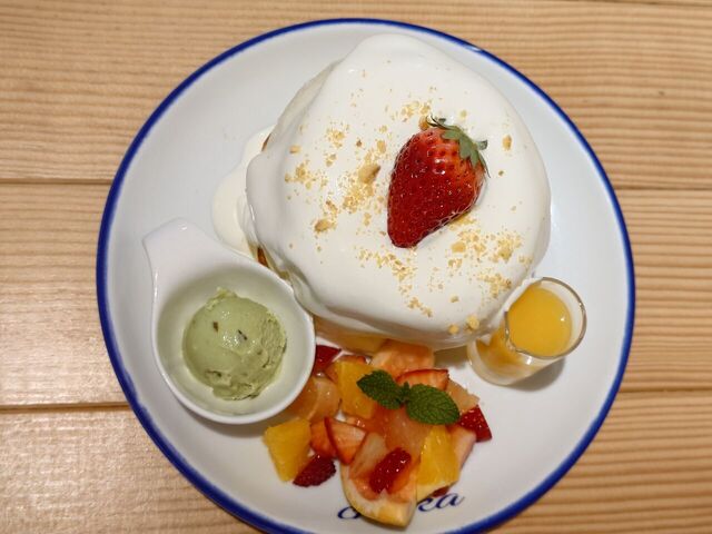 パンケーキの生地に白いメレンゲがところどころに見えて、本当にふわっふわなパンケーキを堪能。