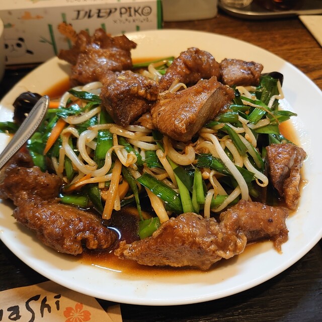 ニラ炒めの上に衣をまとったレバーが乗っててデカいので独特の歯ごたえで美味い!