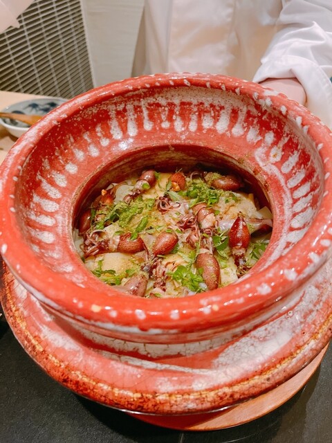 ふぐの白子にもち米を合わせ小鍋で焼き上げたグラタン仕立て