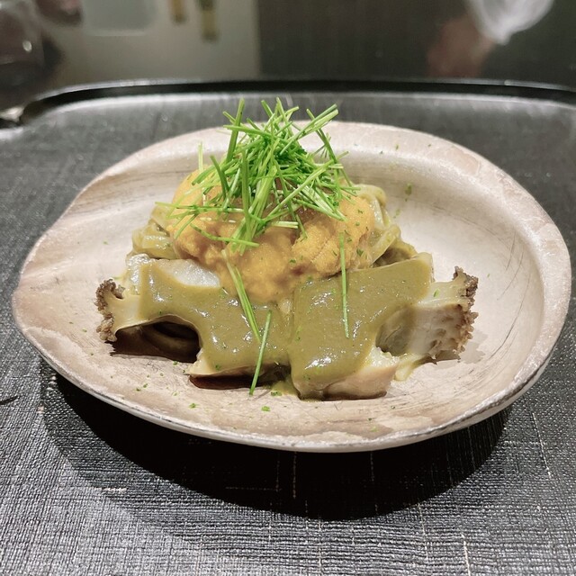 ○北海道長万部産北寄貝とうるいの梅肉和え。ウドを添えて。
