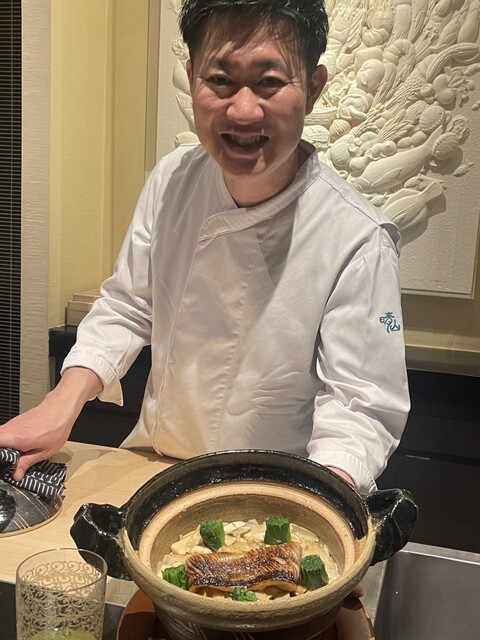 じゃがいも饅頭、穴子、おくらの銀あんかけ。葛粉も入っている餡でとてもじゃがいも饅頭と絡んで美味しいです。