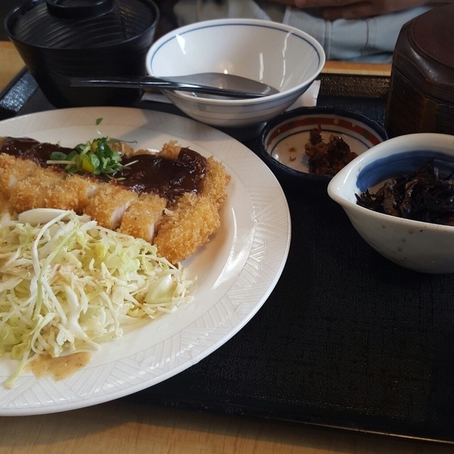 まあまあな厚みのポークにはデミグラスソースとトマトソースの中間のようなソースがかかっていて、供えてあるキャベツの千切りとポテトサラダ、赤だし、マカロニサラダ、煮物、漬物、おひつに入ったご飯、と言ったレパートリー