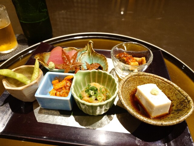 ・枝豆・沢庵チャンジャ・穴子南蛮漬け・そば豆腐
