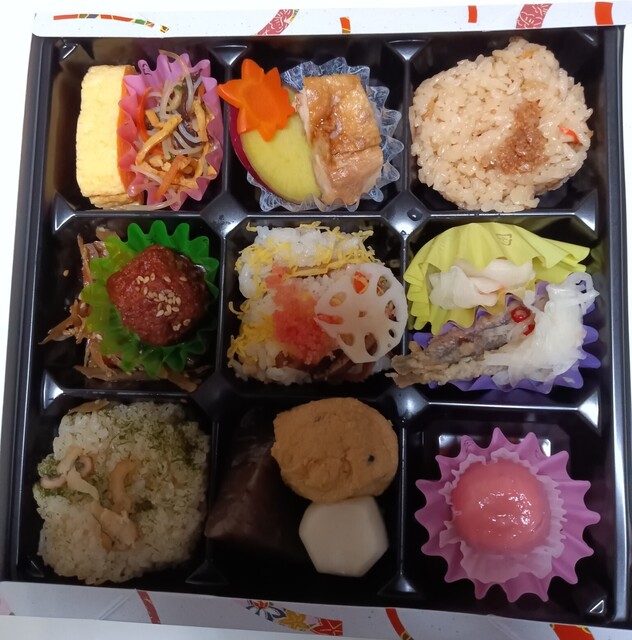 若菜弁当(1080円)。サイトによると、内訳はしょうゆ飯(煮穴子・青のり)、もぐり寿司(おぼろ・椎茸・酢蓮根)、出巻玉子、焼さけ、高野豆腐煮、里芋の煮物、蓮根の煮物、椎茸の煮物、茄子揚げ浸し、小松菜煮浸し、鶏肉揚煮、さつま芋甘煮、牛焼肉、生姜酢漬・広島菜漬。食欲旺盛で若い人には物足りないかもしれませんが、おじさんには丁度いい量&和食で良かったです。