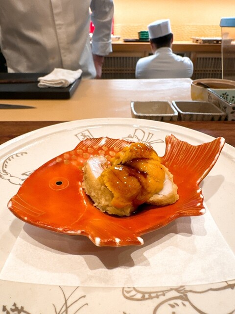 天草 車海老の身と頭、高山寺の国宝鳥獣戯画のお皿