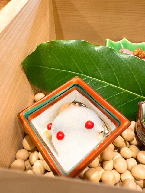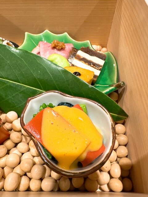 八寸、おから大豆と三度豆、河内鴨のロースト、そら豆青煮、ニシンの甘露煮、干し柿バター、粟生田楽、菜の花と近江蒟蒻の黄身酢、?